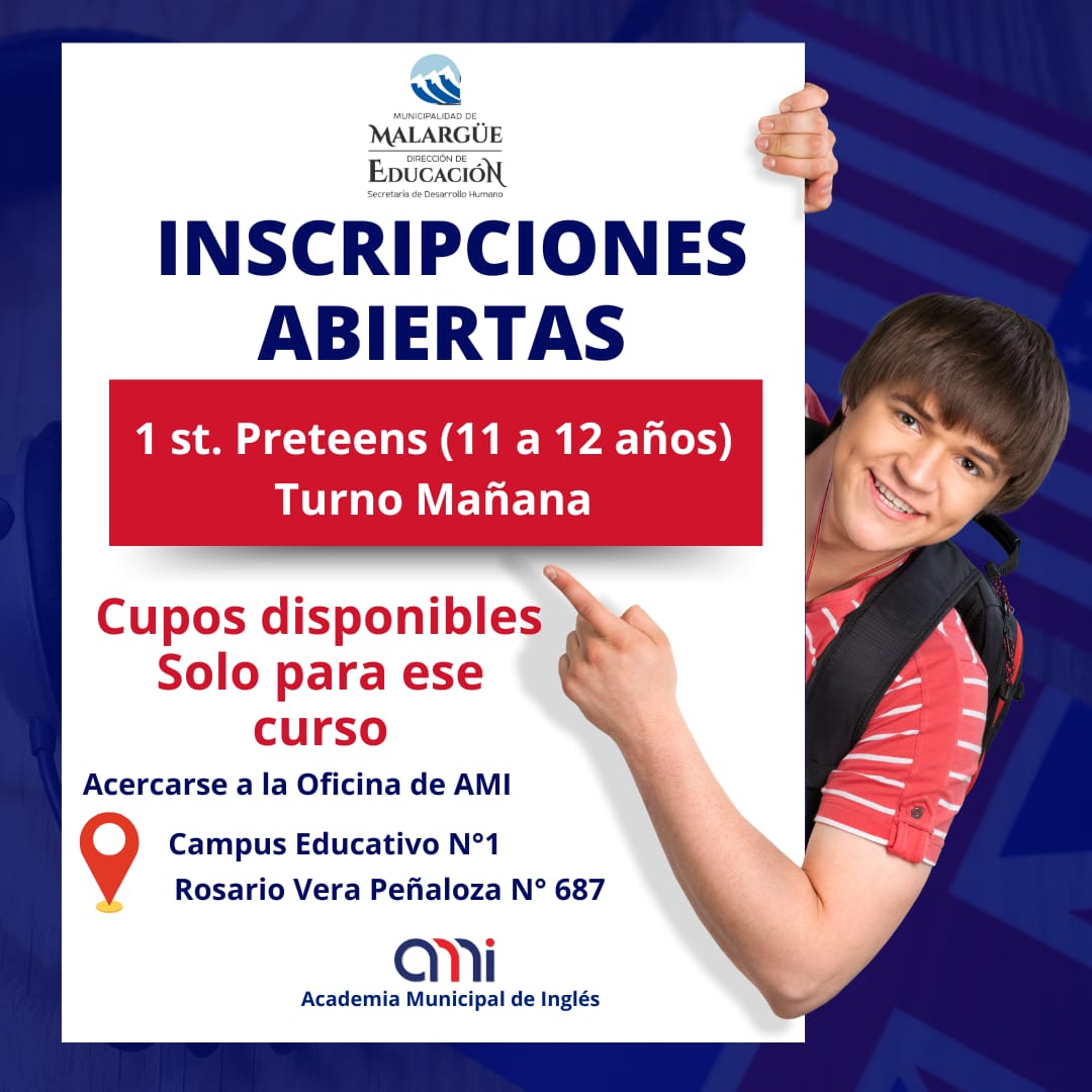 La Dirección de Educación de la Municipalidad de Malargüe informó que se encuentran abiertas las inscripciones para el curso de inglés “1st Preteens”, una propuesta formativa destinada a niños y niñas de entre 11 y 12 años que deseen comenzar o fortalecer su aprendizaje del idioma.