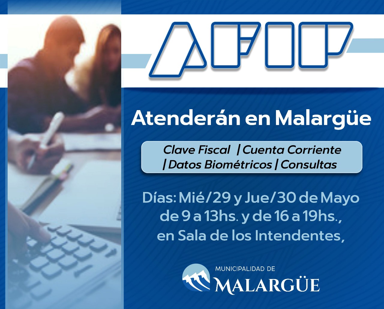 Gracias a las gestiones realizadas por la Municipalidad de Malargüe, la AFIP vuelve a Malargüe para ofrecer a la comunidad la oportunidad de hacer consultas sin necesidad de trasladarse a departamentos vecinos. La atención será este miércoles 29 y jueves 30 en la sala Los Intendentes, de 9 a 13 y de 16 a 19 horas.