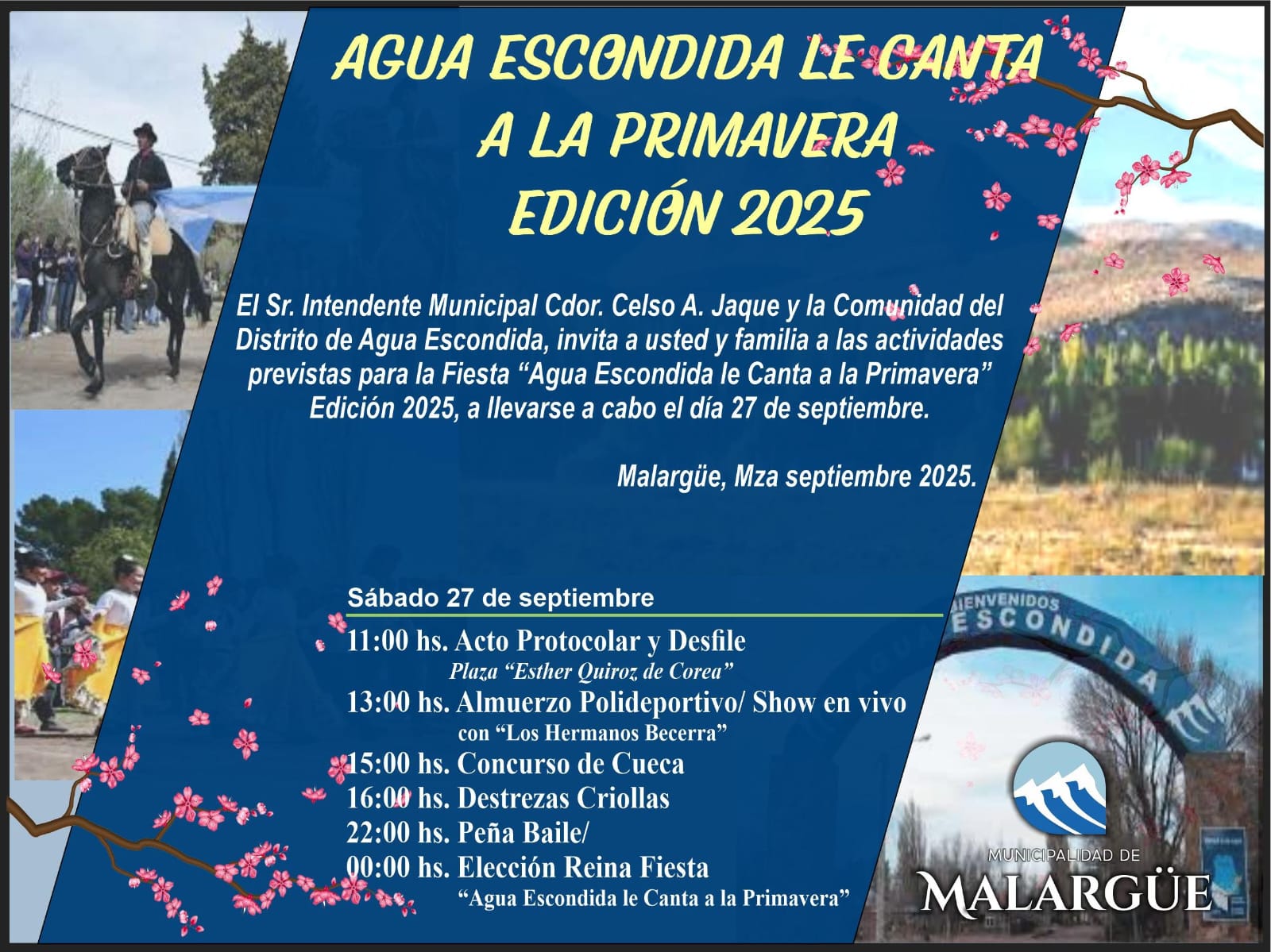 El próximo sábado 27 de septiembre, el distrito de Agua Escondida será escenario de la tradicional fiesta “Agua Escondida le Canta a la Primavera” – Edición 2025, un encuentro que reúne a vecinos, familias y visitantes en una jornada colmada de cultura, tradición y alegría.