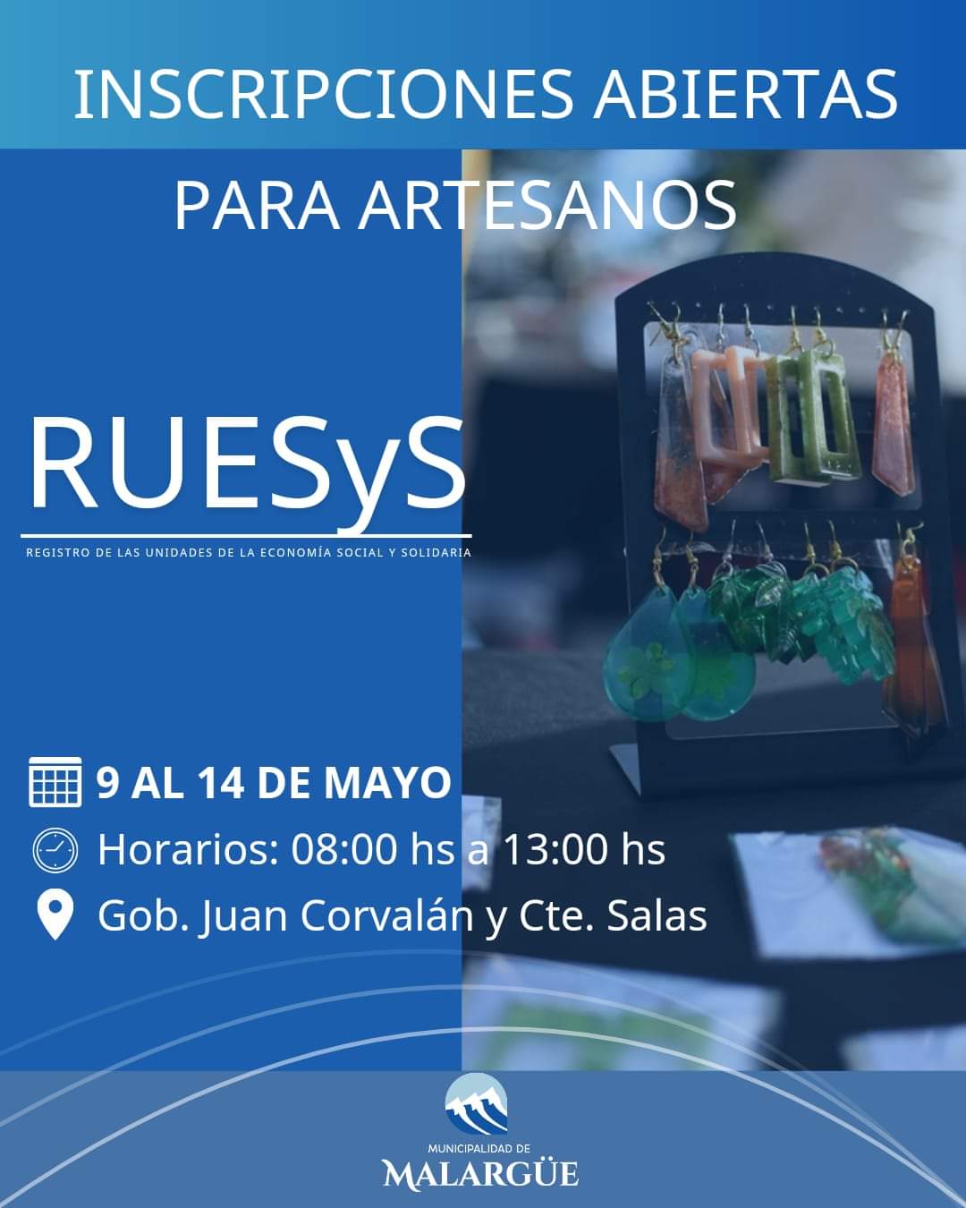 Desde la Dirección de Inclusión y Desarrollo Social, a cargo de la Sra. Paola Jofré, informa que, del 09 al 14 de mayo, se llevará a cabo las inscripciones para todos los artesanos que deseen obtener el Certificado de Registro de Unidades de la Economía Social y Solidaria (RUESyS).