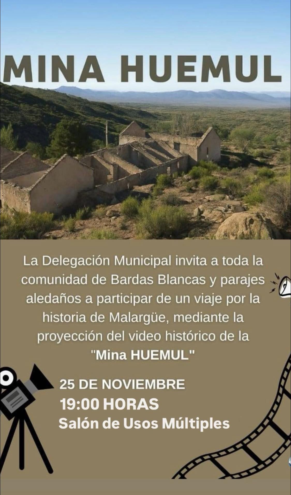 La Delegación Municipal convoca a la comunidad a reencontrarse con su historia a través de la proyección del video “Mina Huemul”. La actividad se realizará el 25 de noviembre, a las 19 horas, en el SUM de Bardas Blancas.