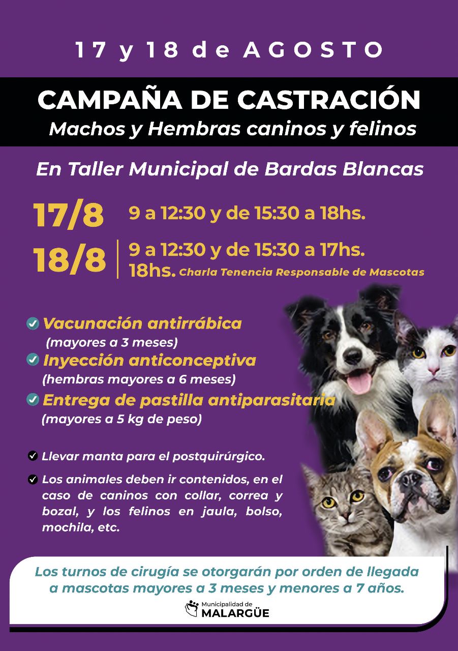 Sobre la campaña de castración comunicó que está programada para los días 17 y 18 de agosto en el Taller Municipal en los siguientes horarios: