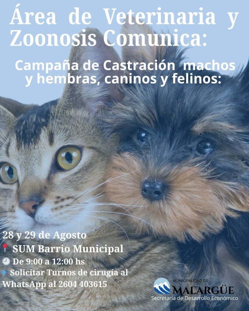 El Área de Veterinaria y Zoonosis de la Municipalidad de Malargüe lleva adelante una campaña más de castración y atención veterinaria gratuita destinada a machos y hembras (caninos y felinos). La actividad se realiza los días 28 y 29 de agosto, de 9:00 a 12:00 horas, en el SUM del Barrio Municipal.