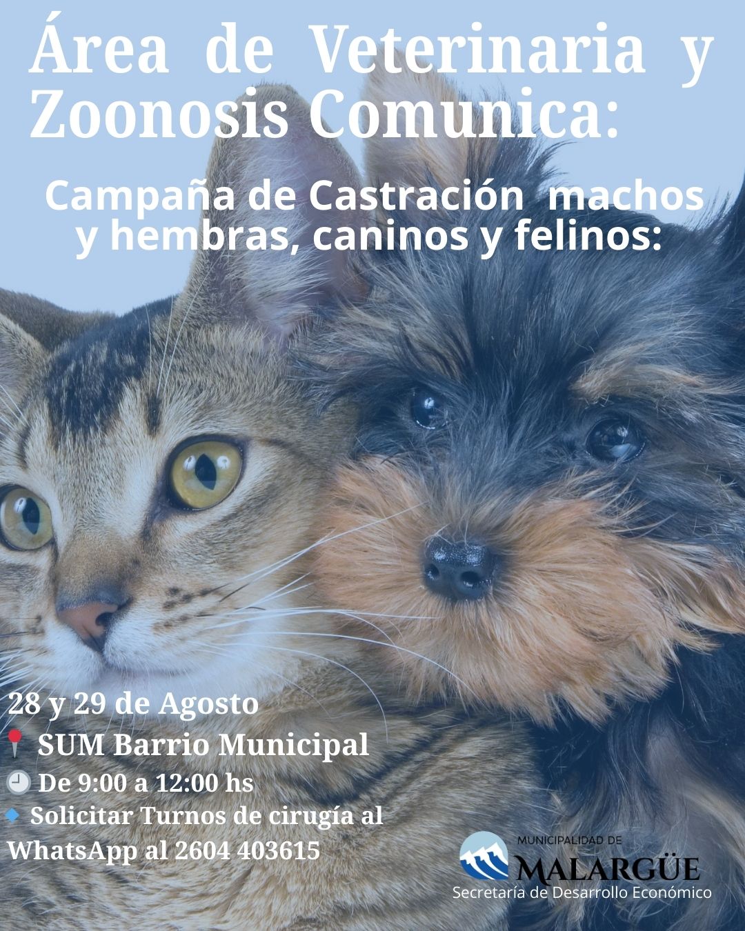 El Área de Veterinaria y Zoonosis de la Municipalidad de Malargüe lleva adelante una campaña más de castración y atención veterinaria gratuita destinada a machos y hembras (caninos y felinos). La actividad se realiza los días 28 y 29 de agosto, de 9:00 a 12:00 horas, en el SUM del Barrio Municipal.