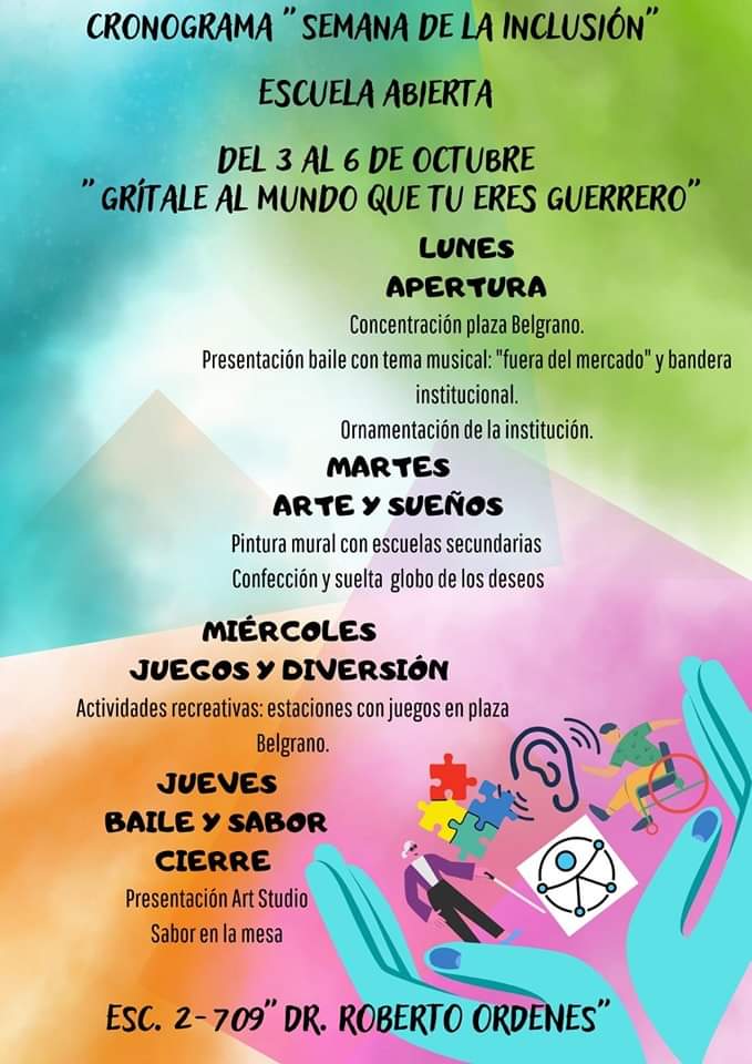 - «Lanzamiento oficial de la semana de la inclusión educativa por los medios locales: Virtuales, radio, TV y redes sociales. Visita escuela Roberto Órdenes, encuentro deportivo (fútbol, vóley) a cargo de los profesores de educación física de ambas escuelas.