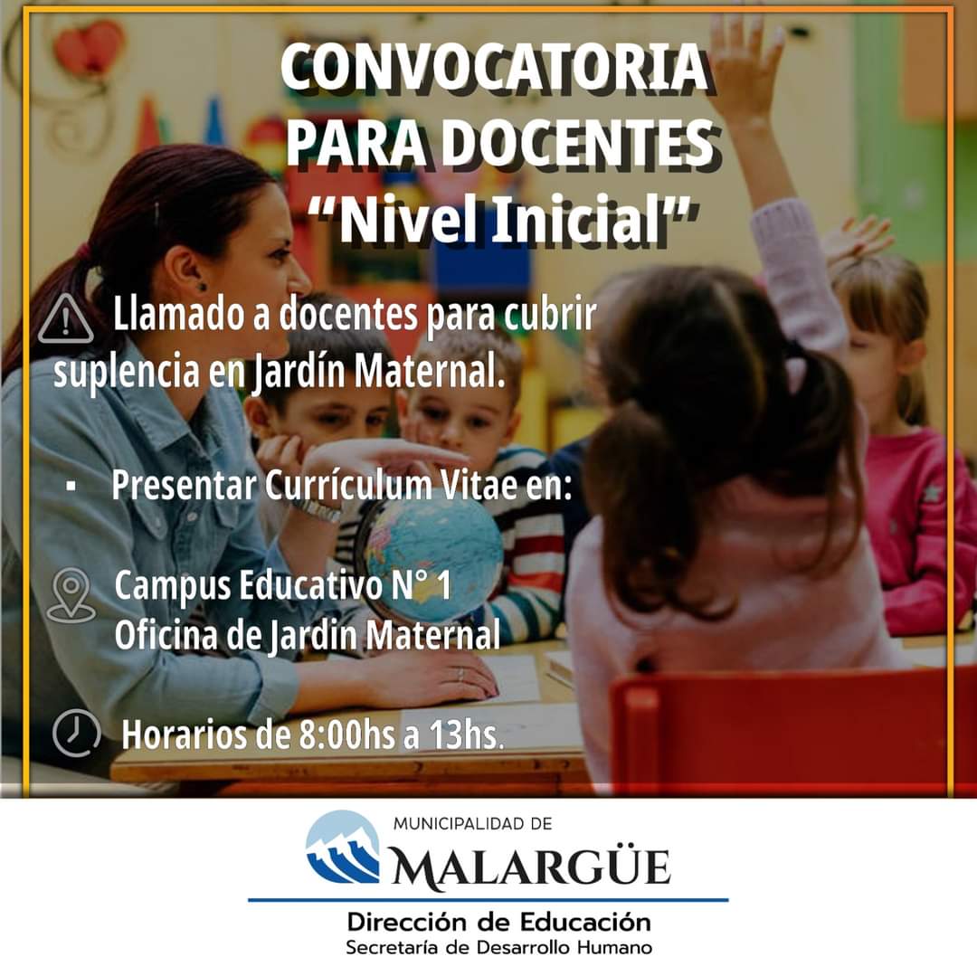 La misma será para cubrir suplencias en Jardín Maternal que dependen de dicha dirección. Los interesados deberán presentar Curriculum Vitae en el Campus Educativo Municipalidad N° 1, en Oficina de Jardín Maternal, en el horario de 8:00 a 13:00 hs.