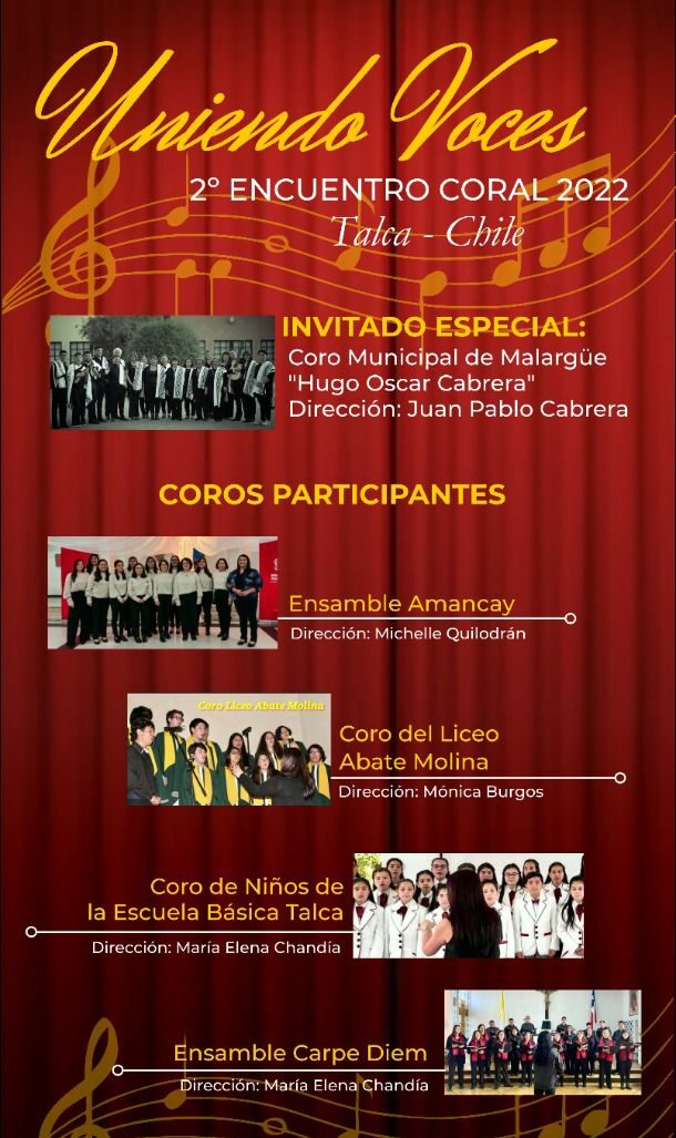 Juan Pablo Cabrera, referente del Coro Municipal, detalló el cronograma desarrollado durante el encuentro y expresó que compartieron escenario con Erica Sepúlveda, corista solista reconocida de Valparaiso, para interpretar el Gloria de la Misa Criolla como así también manifestó que cantaron en la biblioteca popular de Talca con un repertorio de cuecas, tangos y carnavalitos; además de la Catedral del lugar.