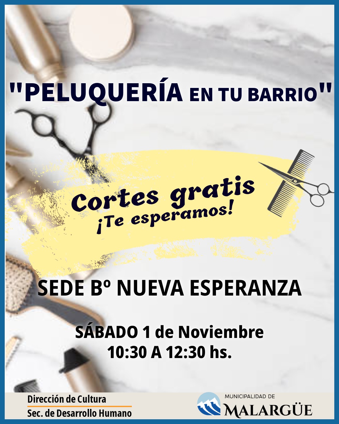 La Dirección de Cultura y la Secretaría de Desarrollo Humano de la Municipalidad de Malargüe invitan a los vecinos del barrio Nueva Esperanza a participar de una nueva jornada de “Peluquería en tu barrio”. Se ofrecerán cortes de cabello gratuitos el sábado 1 de noviembre, de 10:30 a 12:30 hs, en el SUM del barrio.
