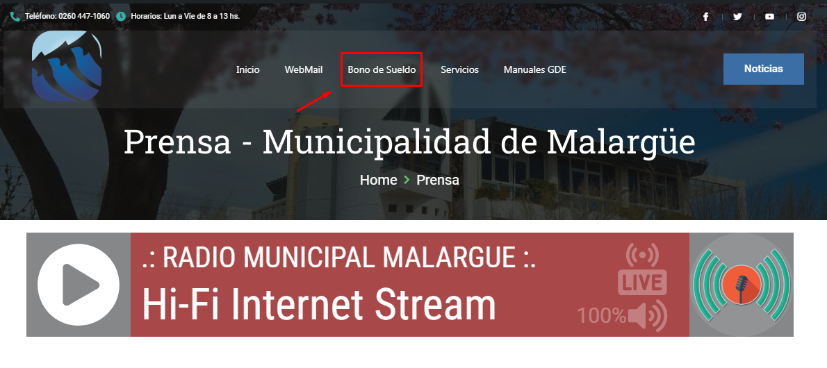 • Ingresa a www.malargue.gov.ar y selecciona la opción “Bono de sueldo”, que se encuentra en la parte superior de la pantalla -si lo estás visualizando desde una computadora- y si lo estás haciendo desde un móvil podrás seleccionarla desplegando el icono: .