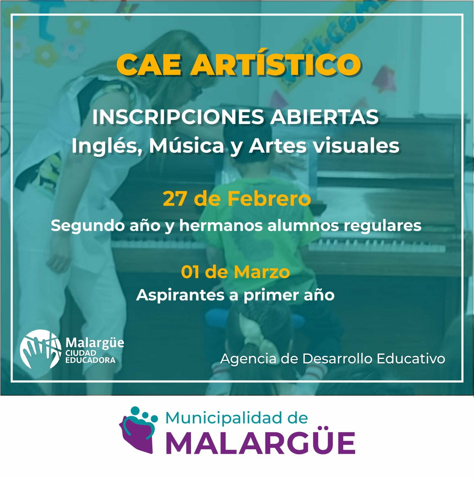 Este lunes 27 de febrero y miércoles 1 de marzo estará abierta la inscripción para el ciclo lectivo 2023 del CAE Artístico perteneciente a la Agencia de Desarrollo Educativo de la Municipalidad de Malargüe.