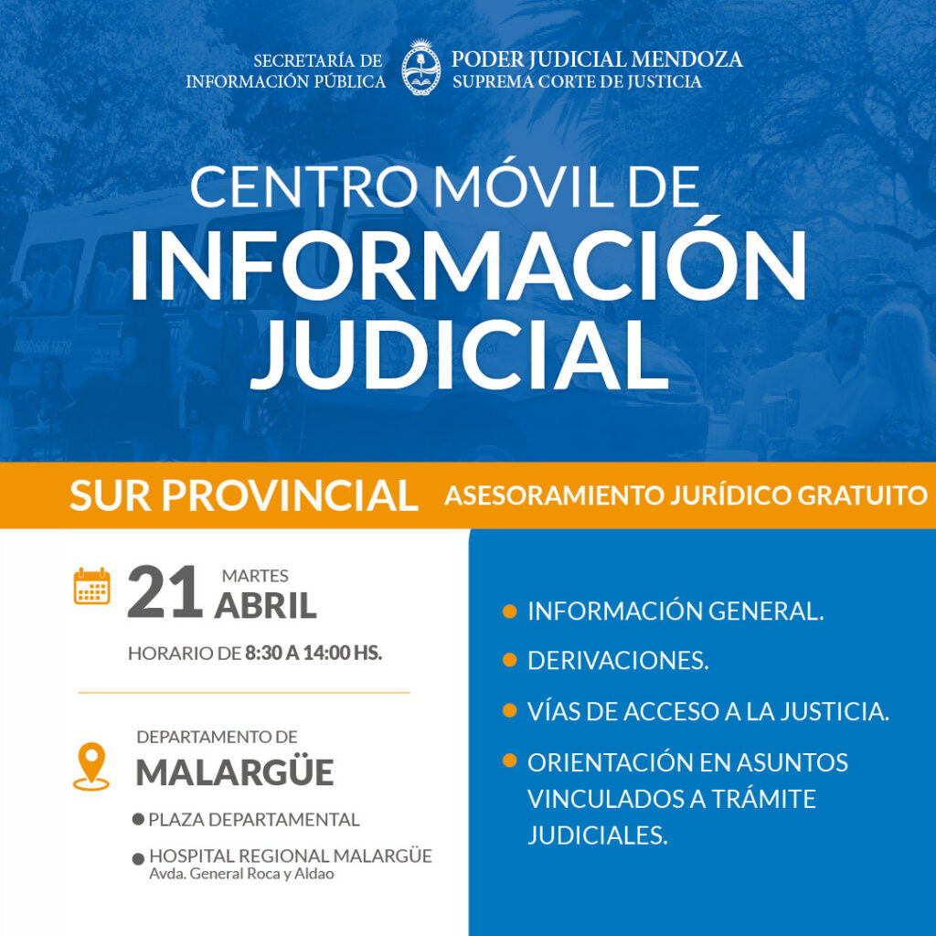 El Centro Móvil de Información Judicial, una iniciativa de la Suprema Corte de Justicia de Mendoza a través de su Secretaría de Información Pública, llegará al departamento de Malargüe con el objetivo de acercar la justicia a los vecinos mediante un servicio gratuito, accesible y descentralizado.