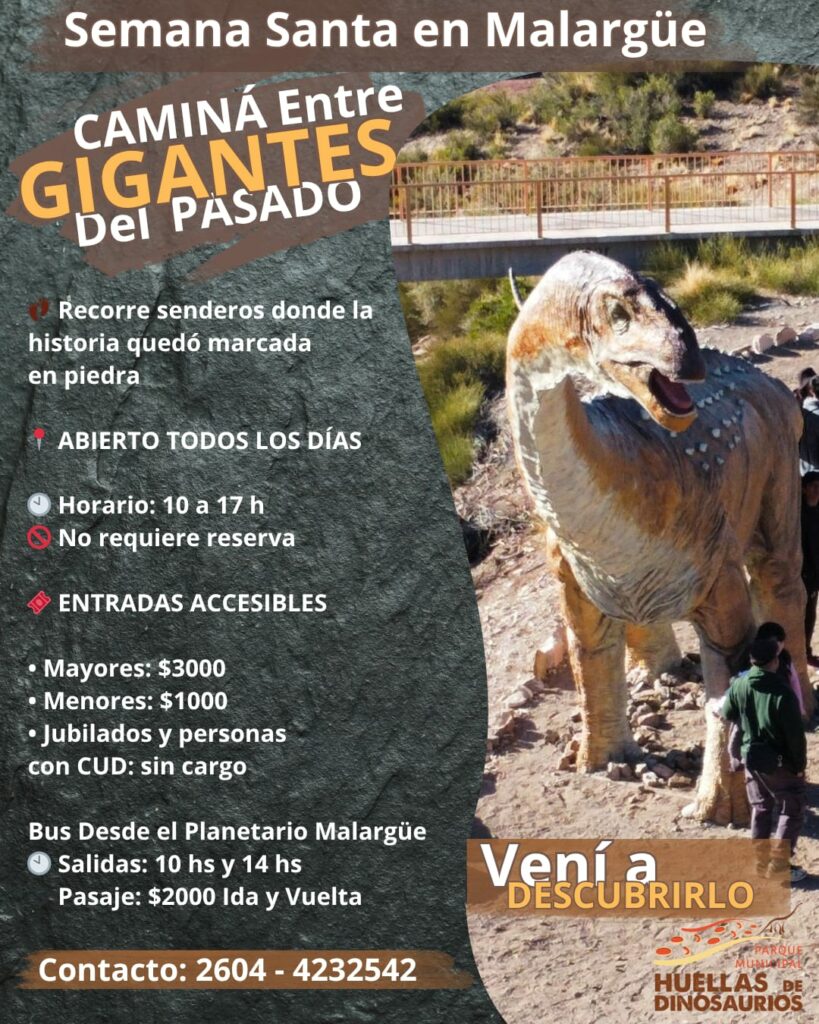 En el marco de los festejos de Semana Santa, la ciudad de Malargüe presenta una atractiva agenda turística y recreativa centrada en el Parque Municipal Huellas de Dinosaurios. La propuesta combina naturaleza, historia y entretenimiento para visitantes de todas las edades.
