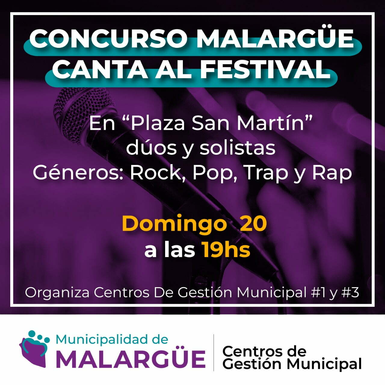 Los centros de gestión Nº 1 y 3 han organizado para este domingo 20 de noviembre el concurso “Malargüe Canta al Festival”, que tendrá lugar a partir de las 19 horas en la plaza San Martín. Allí podrán participar voces malargüinas del pop, rock, trap y rap para que se den a conocer al público presente y hacerse acreedor del premio de la competencia.