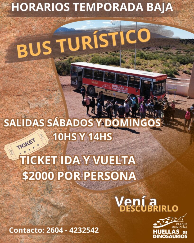 En plena temporada baja, el Bus Turístico de la ciudad sigue ofreciendo un recorrido único por las Huellas de Dinosaurios en el Parque Municipal. Las salidas ahora están disponibles los sábados y domingos a las 10:00 y 14:00 horas. El ticket ida y vuelta tiene un costo de $2.000 por persona.