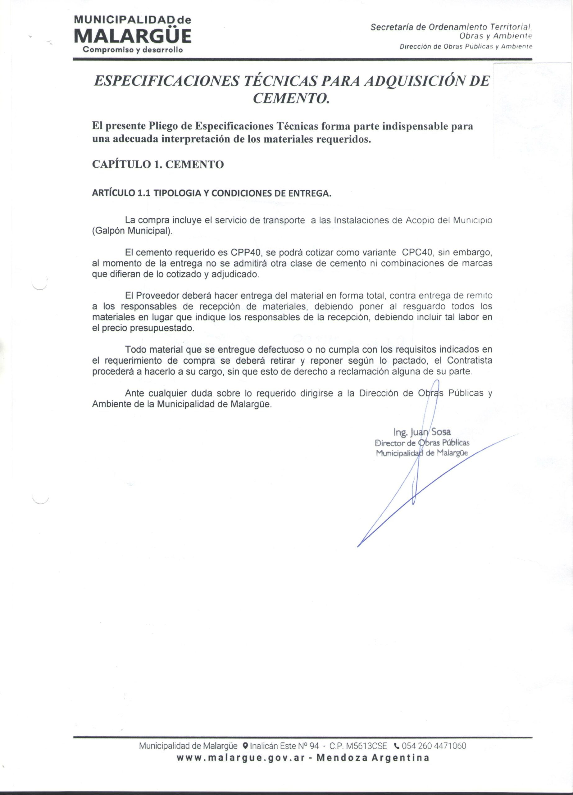 LA MUNICIPALIDAD DE MALARGÜE, EXPTE. Nº 6422/2022 ADQUISICION DE 1000 BOLSAS DE CEMENTO DESTINADO A LA CONSTRUCCION DE VEREDAS INTERNAS DE PLAZA BELGRANO Y LOSAS DE ALCANTARILLAS DE DIFERENTES CALLES DEL EJIDO URBANO