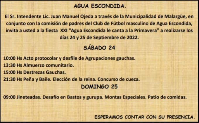 Fue Melania Moraga, delegada del lugar, quien hizo extensiva la invitación para este sábado 24 y domingo 25 de setiembre para participar de la fiesta Agua Escondida le Canta a la Primavera y detalló el cronograma, el que a continuación compartimos: