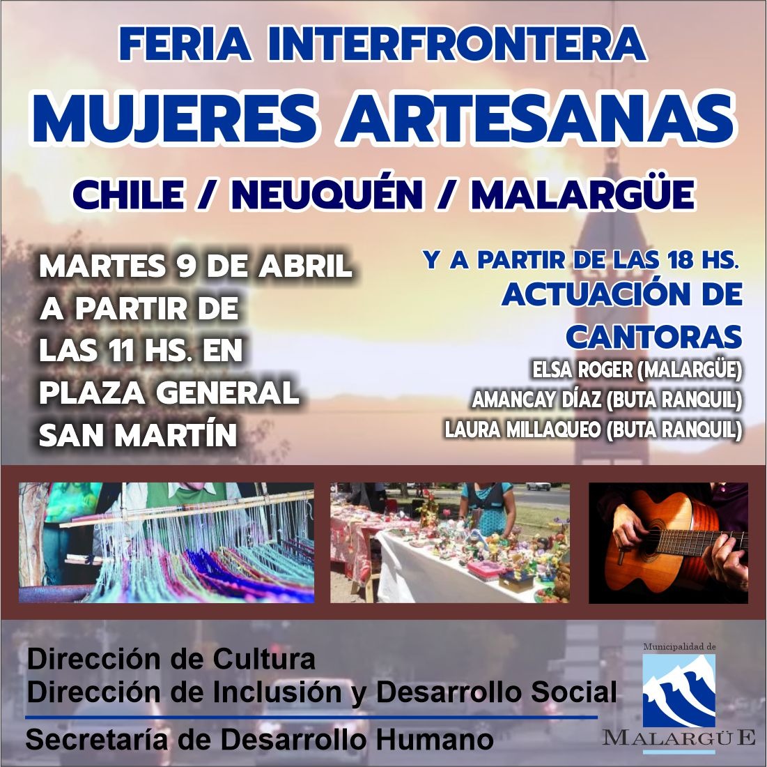 Desde las direcciones de Cultura e Inclusión y Desarrollo Social, dependiente de la Secretaría de Desarrollo Humano, se invita a todos los vecinos a la Feria Interfrontera “Mujeres Artesanas” el día 09 de abril, desde las 11:00 hs. en la plaza general San Martín, teniendo en consideración que a las 18:00 hs. se sumarán otros espectáculos artísticos.