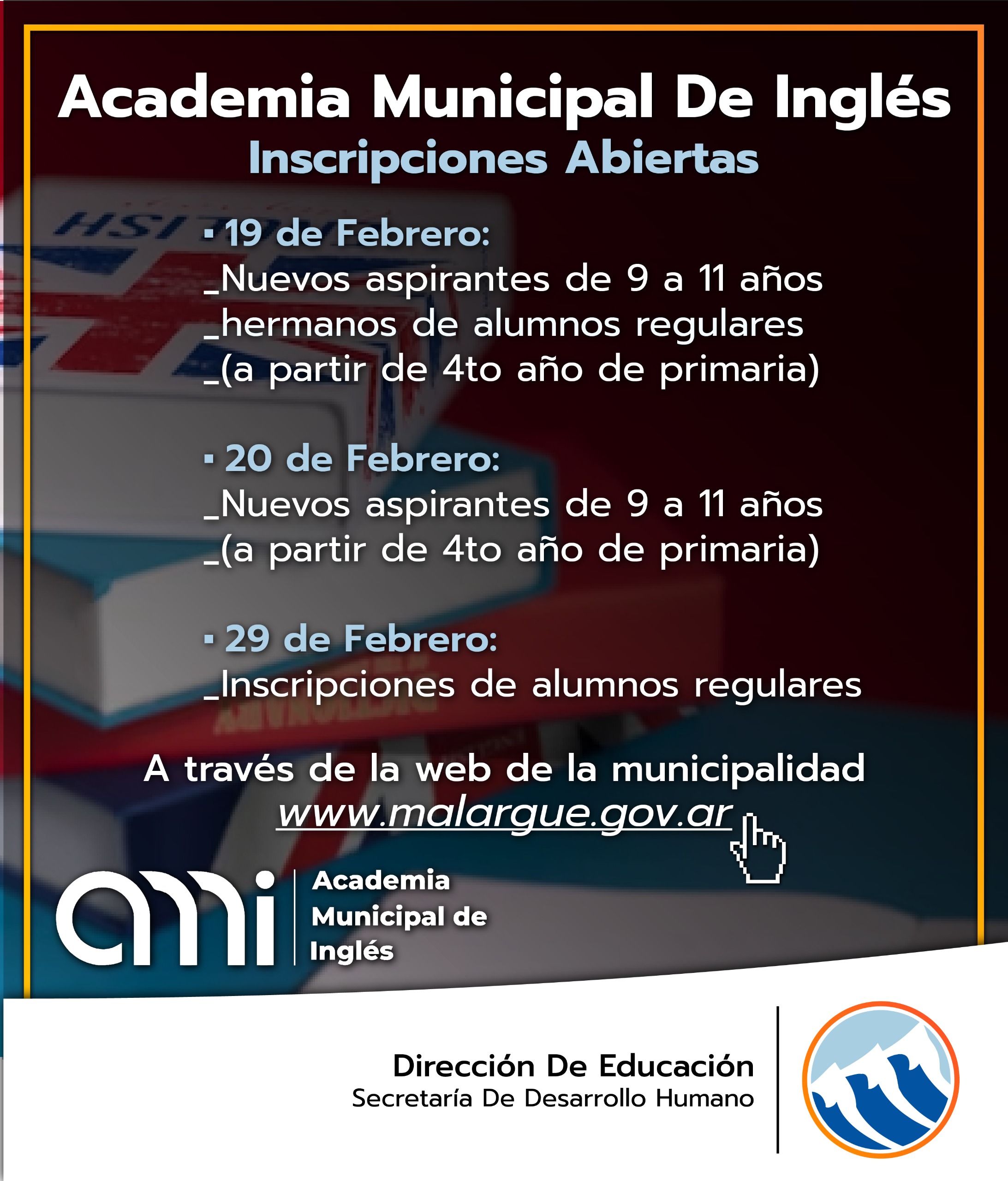 Desde la Dirección de Educación, dependiente de la Secretaria de Desarrollo Humano, la coordinadora de la Academia de Inglés Erica López, informa a todos los interesados que se encuentra abierta la inscripción del ciclo lectivo 2024 a partir del día 19 de febrero del corriente año.