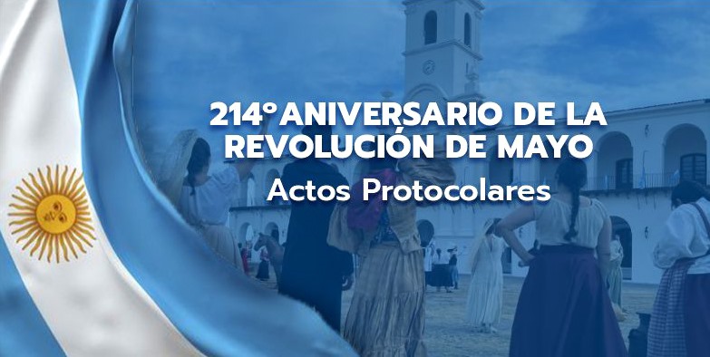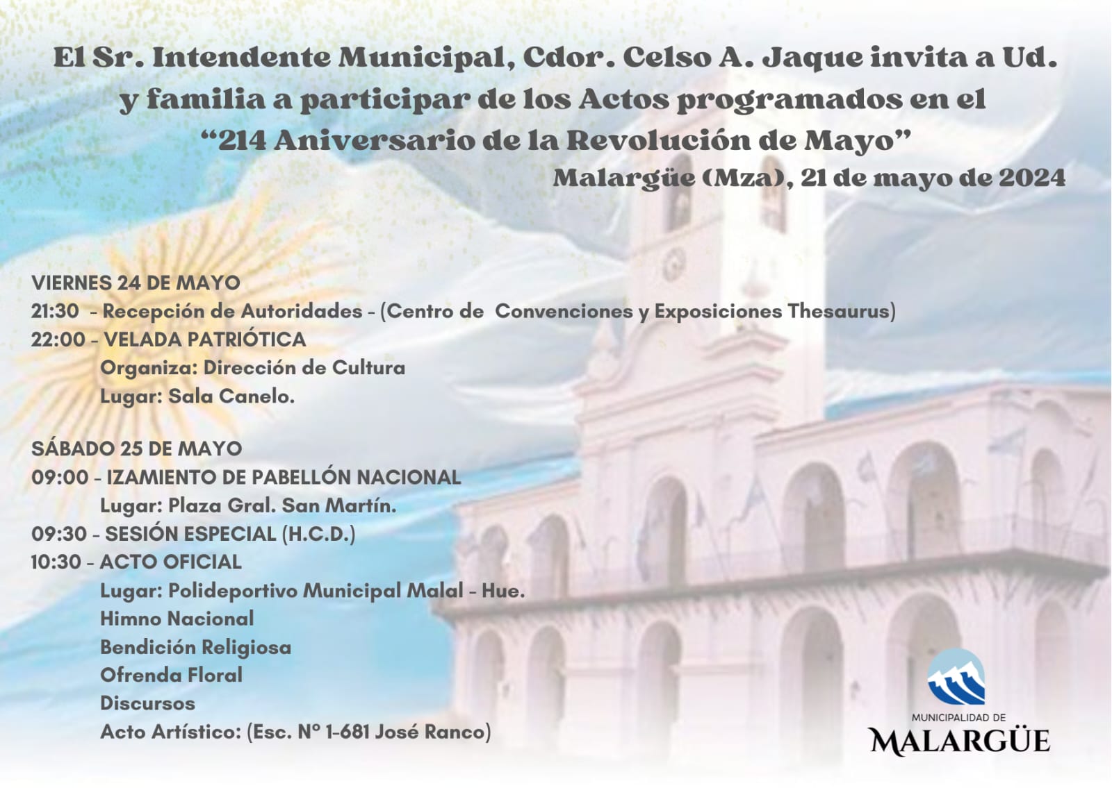El Sr. Intendente Municipal, Cdor. Celso Alejandro Jaque invita a Ud. y familia a participar de los Actos Protocolares programados por el “214º Aniversario de la Revolución de Mayo”.
