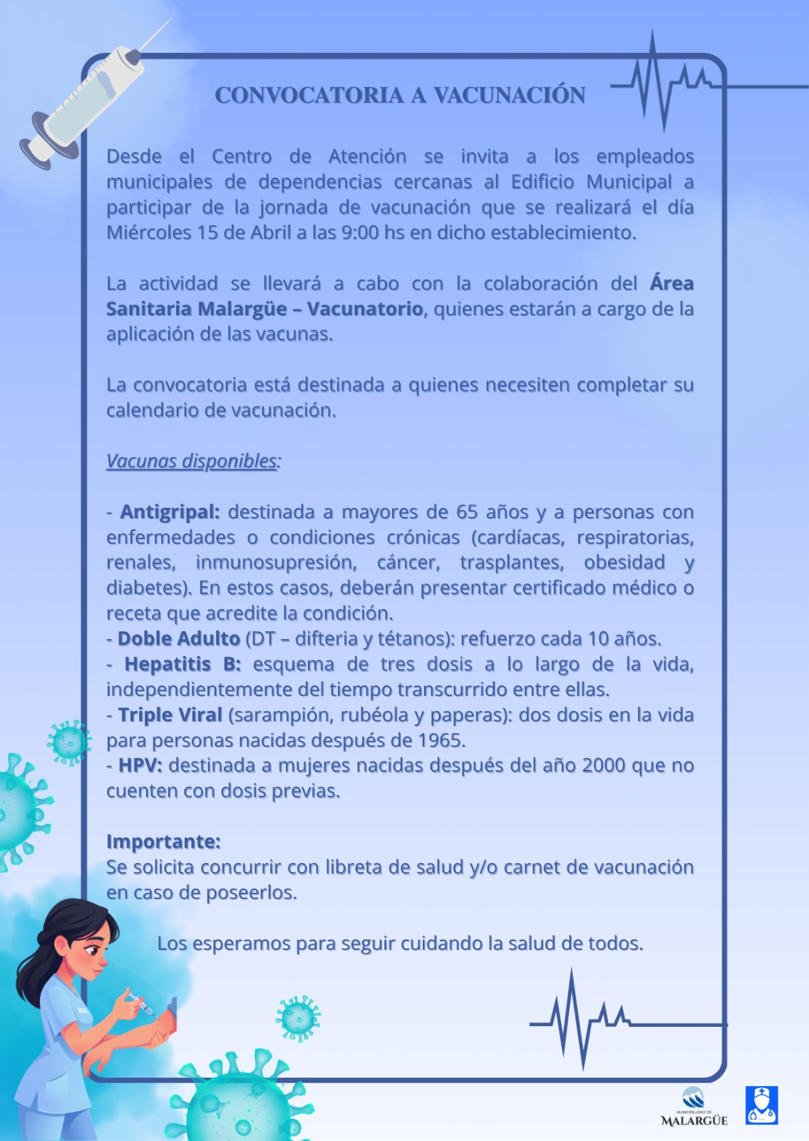El próximo miércoles 15 de abril a las 9:00 hs, el Centro de Atención Municipal invita a todos los empleados municipales de las dependencias cercanas al Edificio Municipal a participar de una jornada de vacunación que se llevará a cabo en el mismo establecimiento. La actividad se realizará con la colaboración del Área Sanitaria Malargüe – Vacunatorio, quienes serán los encargados de la aplicación de las vacunas.