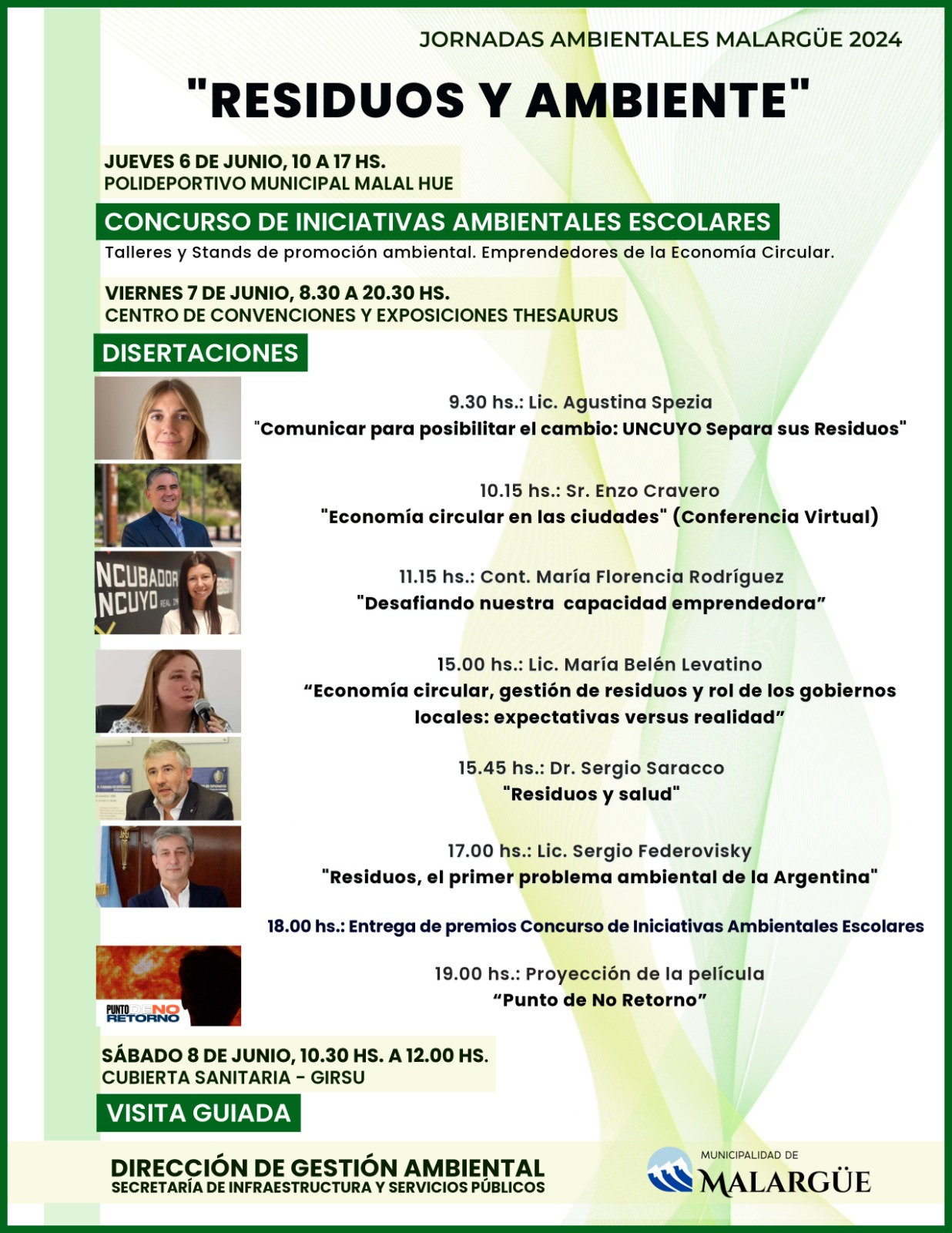 La propuesta para este año es amplia y diversa en cuanto a contenidos y públicos, ya que iniciará el día jueves 6 en el Polideportivo Municipal Malal – Hue de 10:00 a 17:00 hs. con un “Concurso de Iniciativas Ambientales Escolares” Bases y Condiciones Aquí en las que habrá stand con talleres y promociones ambientales y de economía circular, destacando la participación de diversas instituciones con proyectos relacionados al ambiente.