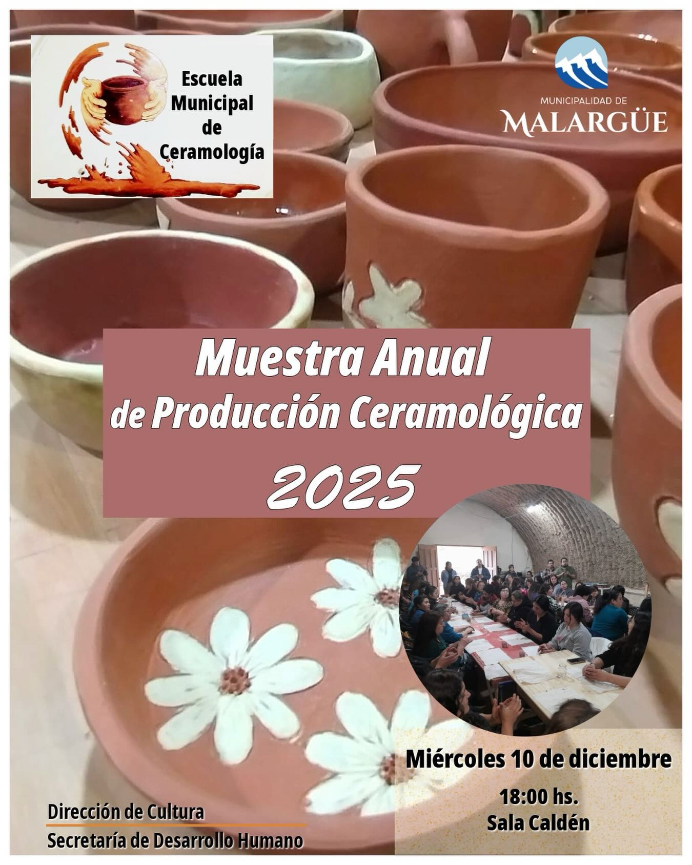 La Escuela Municipal de Ceramología invita a la comunidad a recorrer las obras realizadas durante el año y descubrir el proceso creativo, las técnicas y el talento de sus estudiantes. La exposición será el miércoles 10 de diciembre, a las 18 horas, en la Sala Caldén de Malargüe.