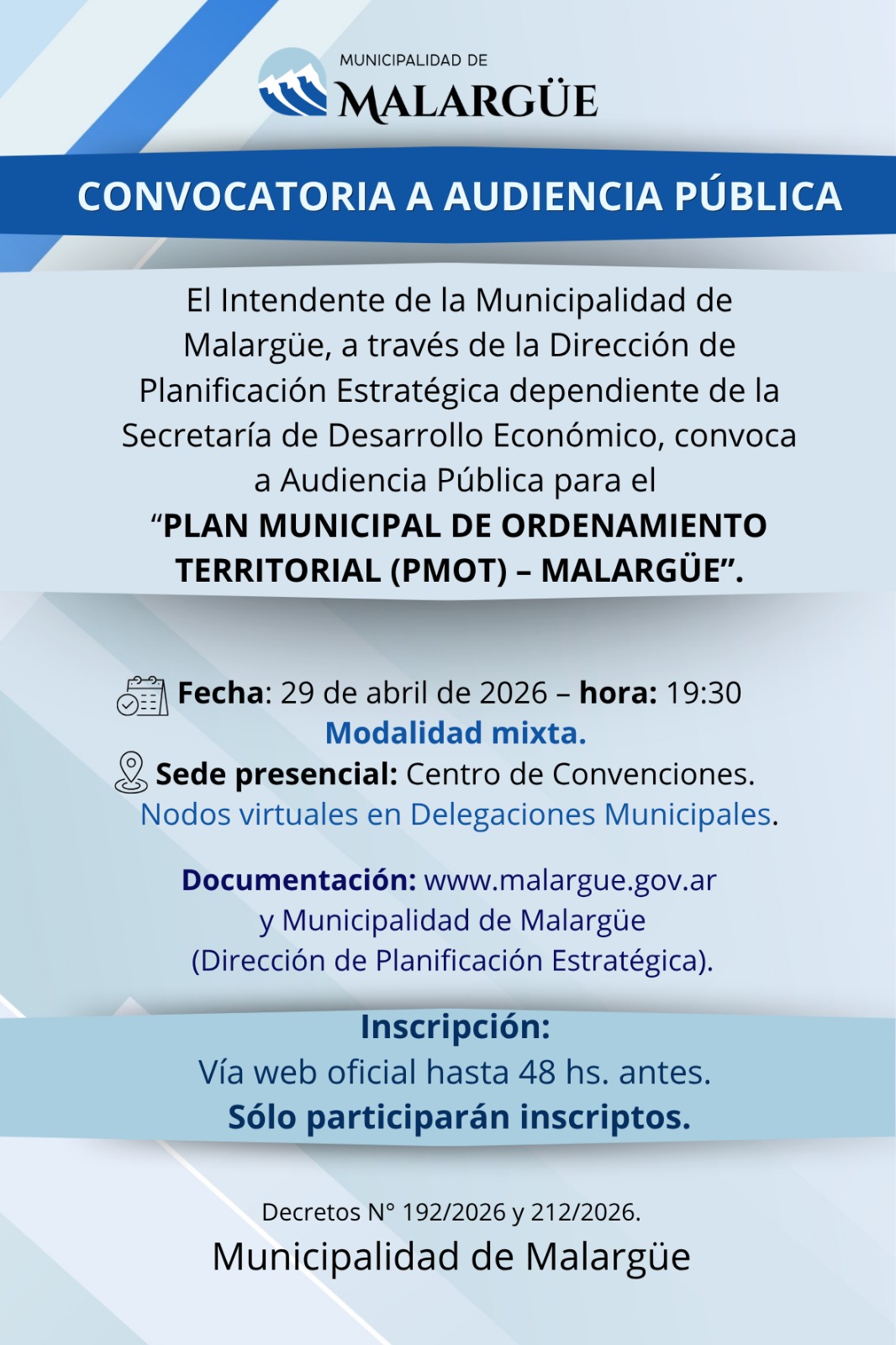 La Municipalidad de Malargüe lanzó la convocatoria a una audiencia pública para abordar el Plan Municipal de Ordenamiento Territorial (PMOT) 2026, una herramienta estratégica que definirá el crecimiento urbano, rural y ambiental del departamento en las próximas décadas.