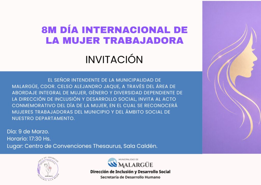 En el marco del Día Internacional de la Mujer Trabajadora, el Señor Intendente de la Municipalidad de Malargüe, Cdor. Celso Alejandro Jaque, a través del Área de Abordaje Integral de Mujer, Género y Diversidad de la Dirección de Inclusión y Desarrollo Social, invita a toda la comunidad a participar del acto conmemorativo que se llevará a cabo hoy 9 de marzo.