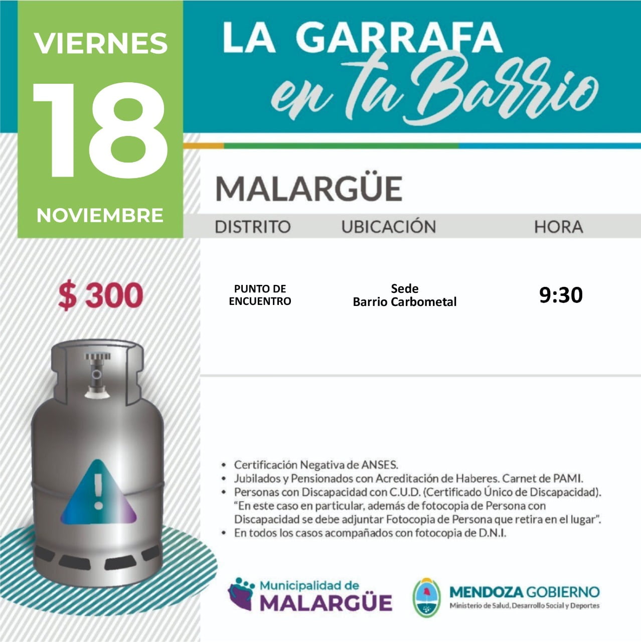 - Personas con discapacidad presentar CUD (Certificado Único de Discapacidad) y además de la fotocopia del DNI de la persona con discapacidad, es necesaria la copia del documento de quien retira la garrafa.