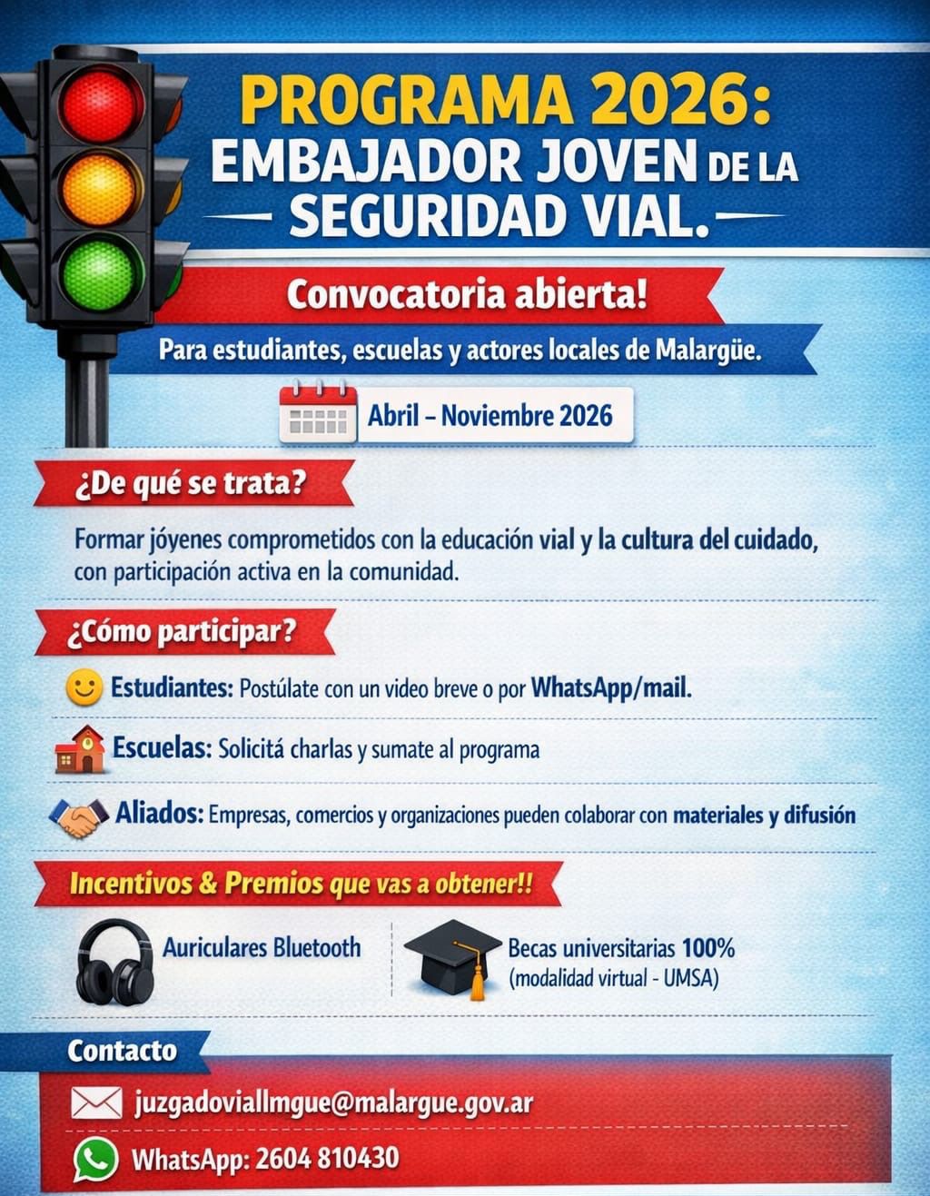 El Juzgado Vial Municipal de Malargüe presentó la convocatoria 2026 del programa “Embajador Joven de la Seguridad Vial”, una iniciativa destinada a formar jóvenes comprometidos con la educación vial y la cultura del cuidado en Malargüe.