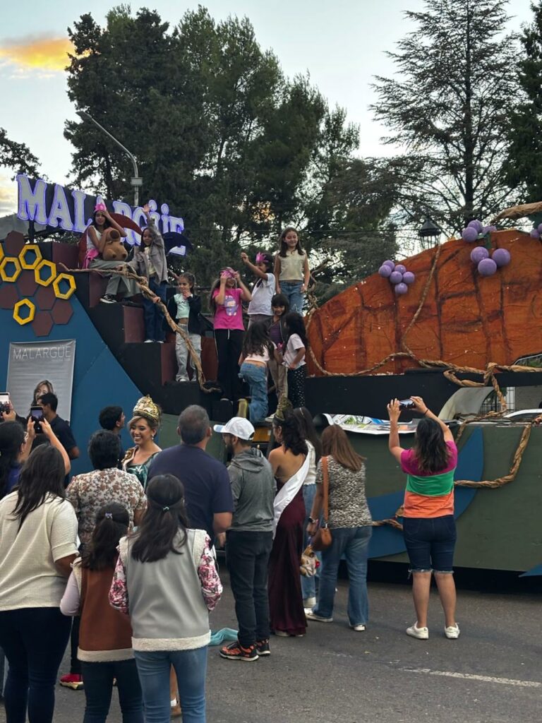La soberana llegó acompañada por el tradicional carro vendimial y fue recibida con una cálida bienvenida por parte de la comunidad. Entre aplausos, muestras de cariño y la emoción de los presentes, vecinos y familias se acercaron para saludarla y acompañarla en este significativo regreso, celebrando su representación en el máximo evento vendimial de la provincia.