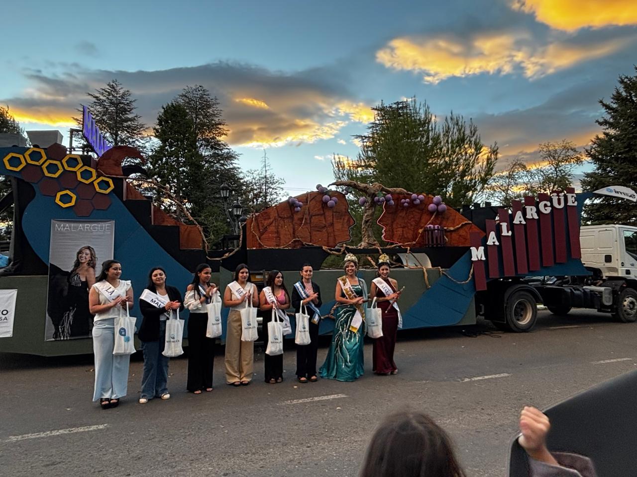 Priscila, quien representó al departamento en la Vendimia Nacional en Mendoza, fue recibida por la comunidad malargüina junto al carro vendimial y acompañada por la corte departamental.