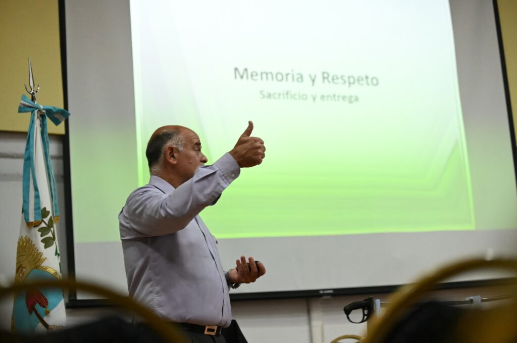 Durante la charla, Herrera evocó los acontecimientos que marcaron la epopeya encabezada por el General José de San Martín, destacando el legado, el coraje y el compromiso que guiaron las campañas emancipadoras. En ese contexto, el Sable de Granadero fue presentado no solo como instrumento militar, sino como un elemento cargado de significado histórico y político, estrechamente ligado al nacimiento de la Nación.