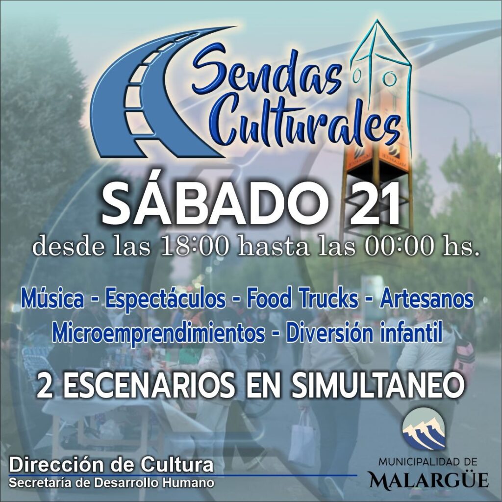 Organizado por la Dirección de Cultura y la Secretaría de Desarrollo Humano de la Municipalidad de Malargüe, Sendas Culturales promete ser una jornada imperdible con una variedad de actividades para todos los gustos. Los asistentes podrán disfrutar de música en vivo con bandas locales y artistas regionales, que se presentarán en dos escenarios simultáneos, ofreciendo una experiencia única para todos los públicos.