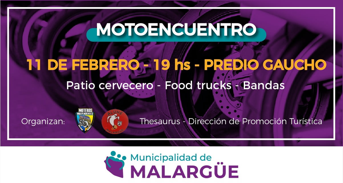 La Dirección de Turismo, en conjunto a Eventos del Centro de Convenciones y la Agrupación Ruta 40 Sede Malargüe trabajan en la organización de un Motoencuentro, a realizarse los días 10, 11 y 12 de Febrero en el Predio Gaucho de nuestra ciudad. Según informaron, ya está confirmada la presencia de más de 100 motoqueros de distintas provincias y de otros países vecinos como Perú, Chile, Brasil, Paraguay y Uruguay.