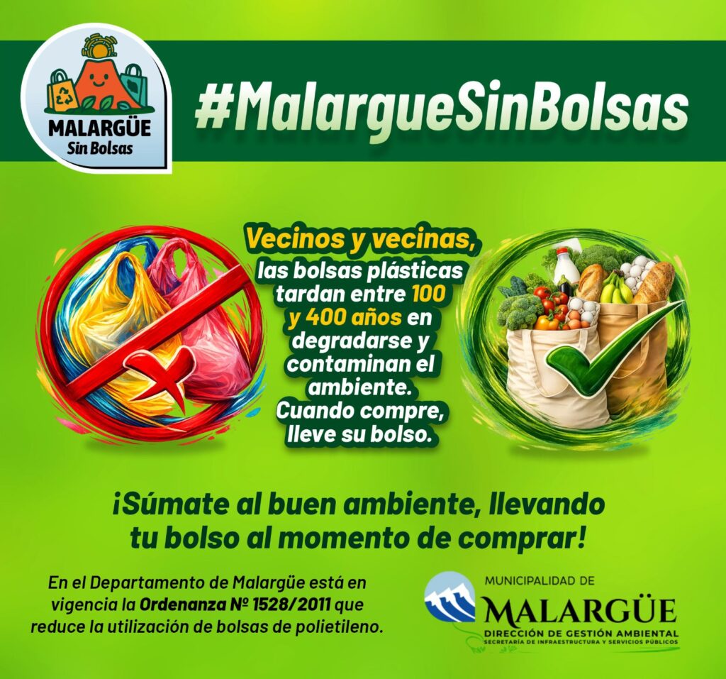 En un esfuerzo por reducir la contaminación ambiental y promover prácticas más sostenibles, la Municipalidad de Malargüe invita a sus vecinos y vecinas a sumarse a la iniciativa #MalargueSinBolsas.