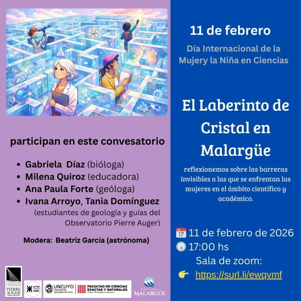 Por su parte, El Laberinto de Cristal en Malargüe el día 11 de febrero a las 17:00 hs). En este conversatorio online reflexionará sobre las barreras invisibles que enfrentan las mujeres en la ciencia y en el ámbito académico. En el panel participarán destacadas científicas y educadoras como Gabriela Díaz (bióloga), Milena Quiroz (educadora), Ana Paula Forte (geóloga), Ivana Arroyo y Tania Domínguez (estudiantes de geología y guías del Observatorio Pierre Auger). El conversatorio será moderado por la astrónoma Beatriz García. La actividad es gratuita y se podrá seguir a través de Zoom, accediendo al siguiente enlace: https://surl.li/ewqvmf
