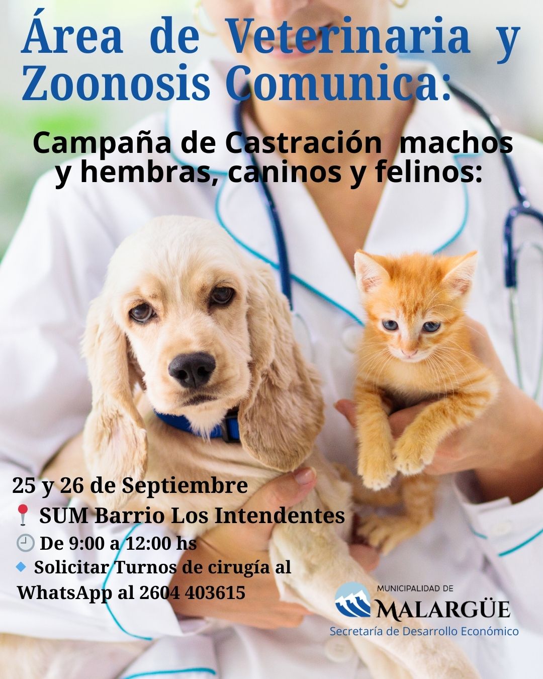 La Municipalidad de Malargüe, a través de la Secretaría de Desarrollo Económico y el área de Veterinaria y Zoonosis, llevará adelante una nueva Campaña de Castración y Salud Animal los días 25 y 26 de septiembre, de 9 a 12 horas, en el SUM del Barrio Los Intendentes.