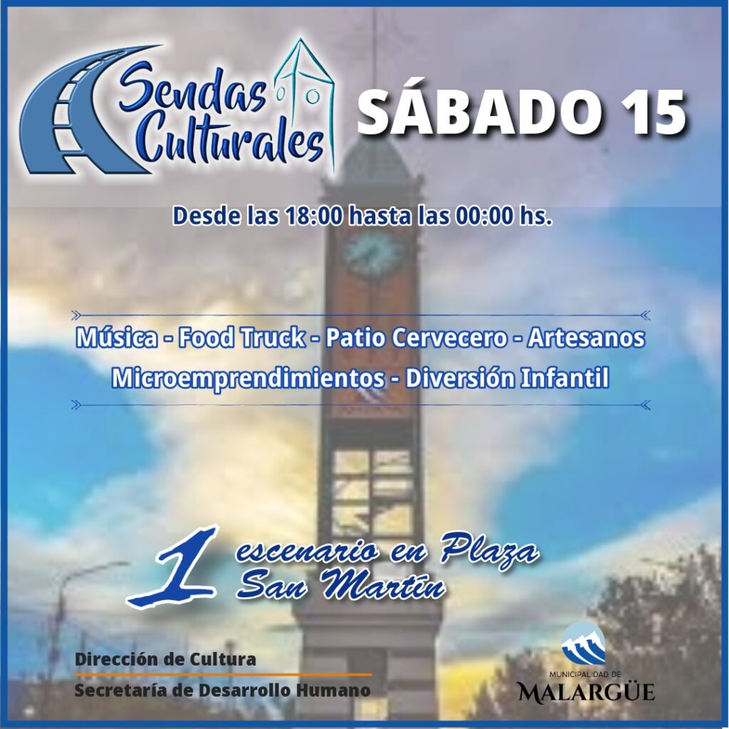 ¡Este sábado 15 de febrero, Malargüe se llena de alegría, música y diversión para toda la familia con una nueva edición de Las Sendas Culturales! Desde las 18:00 hasta las 00:00 hs., la Avenida San Martín se transformará en un vibrante escenario al aire libre, donde podrás disfrutar de una jornada inolvidable con lo mejor de la gastronomía local, música en vivo, artesanías y actividades para los más pequeños. Para los más chicos de la casa, a partir de las 19:00 hs. el Circo Rústico de San Rafael llegará para cautivar con un show lleno de magia y emoción, ¡un espectáculo que no querrán perderse! Mientras tanto, en la Plaza General San Martín, los músicos locales Los Carrascos y Mauri Méndez harán que el ritmo de la música nos contagie a todos, creando una noche de tradición, alegría y baile, perfecta para disfrutar con amigos y familia. Las Sendas Culturales son una invitación a vivir y celebrar lo mejor de nuestra cultura. Este evento, organizado por la Dirección de Cultura de la Municipalidad, se ha convertido en una cita imperdible que nos reúne a vecinos y turistas en un ambiente único de camaradería, creatividad y entretenimiento. Vení con tu familia, amigos, o esa persona especial, trae tu mate y prepárate para disfrutar de una tarde-noche llena de momentos únicos.
