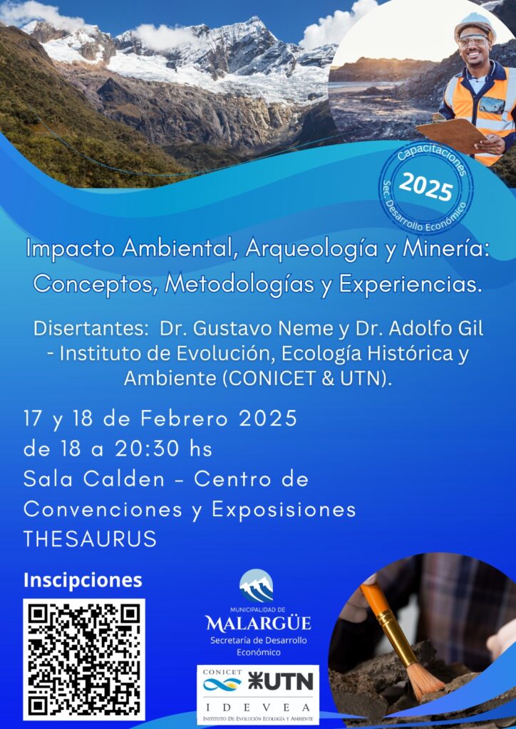 Malargüe será sede de una capacitación de gran relevancia que abordará temas esenciales sobre Impacto Ambiental, Arqueología y Desarrollo Minero. Esta actividad está especialmente dirigida a técnicos, profesionales relacionados con temas ambientales y patrimoniales, así como a empresas vinculadas al sector minero, de construcción vial, de estructuras, petroleras, y a sectores y entes públicos involucrados en la toma de decisiones para la gestión y cuidado del medio ambiente. Disertantes: Dr. Gustavo Neme- Dr. Adolfo Gil- Instituto de Evolución, Ecología Histórica y Ambiente (CONICET & UTN). 17 y 18 de febrero 2025, de 18 a 20:30 hs. Lugar Centro de Convenciones y Exposiciones THESAURUS – Sala Calde. Inscripciones gratis con el QR- se entregará Certificado de Asistencia El Dr. Adolfo Gil, experto en el área, compartió su entusiasmo por la realización de esta capacitación en el departamento, destacando la actividad minera que está generando tanto expectativas como preocupaciones. En este contexto, la capacitación se centrará en los cuidados ambientales, con un enfoque particular en la arqueología, proporcionando una visión integral sobre cómo gestionar de manera responsable el desarrollo minero en el distrito de Malargüe. “Durante este curso-taller, los participantes podrán conocer experiencias previas, tanto nacionales como internacionales, y cómo estas se aplican al contexto de nuestra región”, explicó el Dr. Gil. Además, el curso incluirá aproximadamente 2 horas y media por día de clases teóricas, seguidas de actividades prácticas. Desde la organización, se hace un llamado a todos los interesados a inscribirse y formar parte de esta buena oportunidad. “El objetivo es que los participantes compartan sus conocimientos y experiencias, contribuyendo a un enfoque más responsable y sostenible en cuanto a la gestión ambiental y la preservación del patrimonio cultural de nuestra región”, agregó Gil. Esta capacitación pone de manifiesto el compromiso del Municipio de Malargüe y su Secretaría de Desarrollo Económico, quienes han demostrado un fuerte interés en fortalecer la formación y el conocimiento en temas cruciales para el futuro del departamento. “Estamos muy contentos de retomar estos vínculos con el municipio, que ha demostrado un gran interés en proteger su territorio y sus recursos”, concluyó el Dr. Gil. Si formas parte del sector minero, de la construcción, o trabajas en la gestión de proyectos públicos, esta es tu oportunidad para ampliar tus conocimientos y contribuir al cuidado de nuestro medio ambiente y patrimonio. ¡No te lo pierdas! ¡Inscríbete ahora con el QR y forma parte de esta importante capacitación!