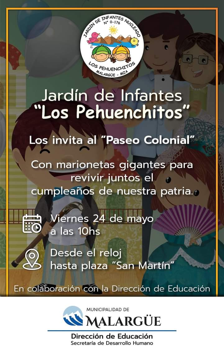 La Dirección de Educación en conjunto con el Jardín de Infantes Nucleado Nº 0-176 “Los Pehuenchitos”, tienen el agrado de invitar a toda la comunidad malargüina a formar parte del Paseo Colonial, en conmemoración a la Semana de Mayo.