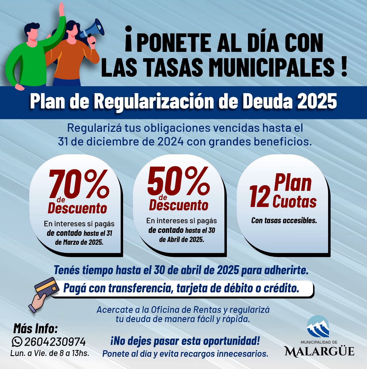 Desde la oficia de Rentas de la Municipalidad de Malargüe, anuncia a todos los vecinos que se encuentra vigente el pago del Periodo 2024 de tasas municipales vencidas con beneficiosos descuentos, de manera fácil y segura.