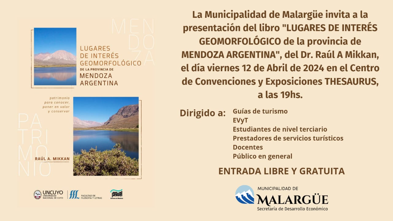 La Municipalidad de Malargüe invita a la presentación del libro “Lugares de interés geomorfológico de la provincia de Mendoza, Argentina. Patrimonio para conocer, poner en valor y conservar” del Dr. Raúl Mikkan, este viernes 12 de abril a las 19:00 hs.  en el Centro de Convenciones y Exposiciones Thesaurus, con entrada libre y gratuita.