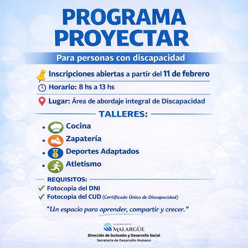 Con el objetivo de fortalecer la inclusión y generar más oportunidades de desarrollo, el Programa Proyectar anunció la apertura de inscripciones para una nueva etapa de actividades destinadas a personas con discapacidad. La convocatoria comenzará el 11 de febrero y se realizará en el horario de 8:00 a 13:00 horas, en el Área de Abordaje Integral de Discapacidad.