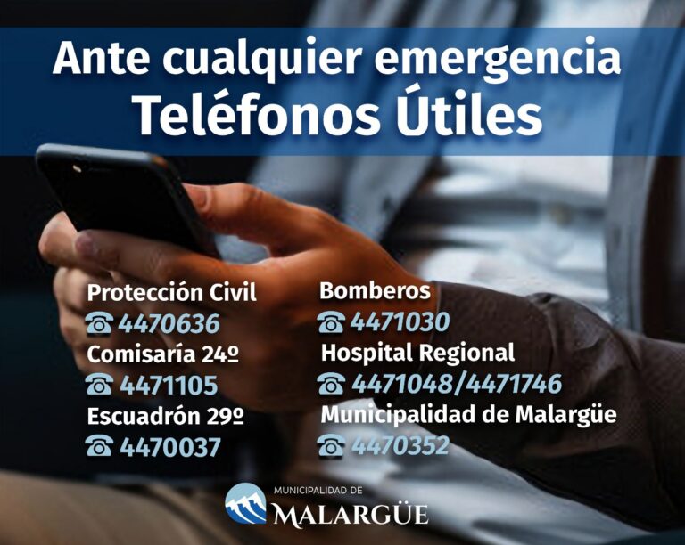 Ante cualquier duda o consulta, el área de Protección Civil de la Municipalidad de Malargüe les recuerda que pueden comunicarse al número telefónico: 260-4470363 o bien, a los demás números emergentes, que se detallan a continuación:
