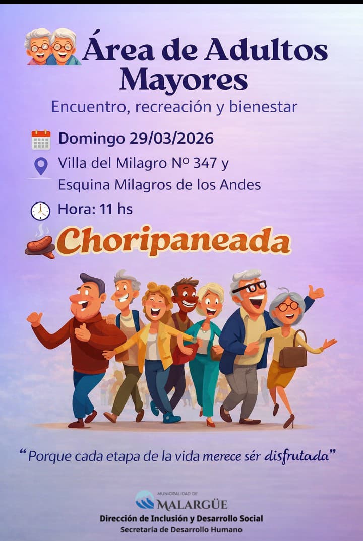 La Dirección de Inclusión y Desarrollo Social, a través del área de Adultos Mayores, invita a todos los adultos mayores a disfrutar de una jornada especial llena de juegos, baile y actividades recreativas. El evento, se llevará a cabo el próximo domingo 29 de marzo de 2026 en la Asociación de Jubilados y Pensionados del Sur.