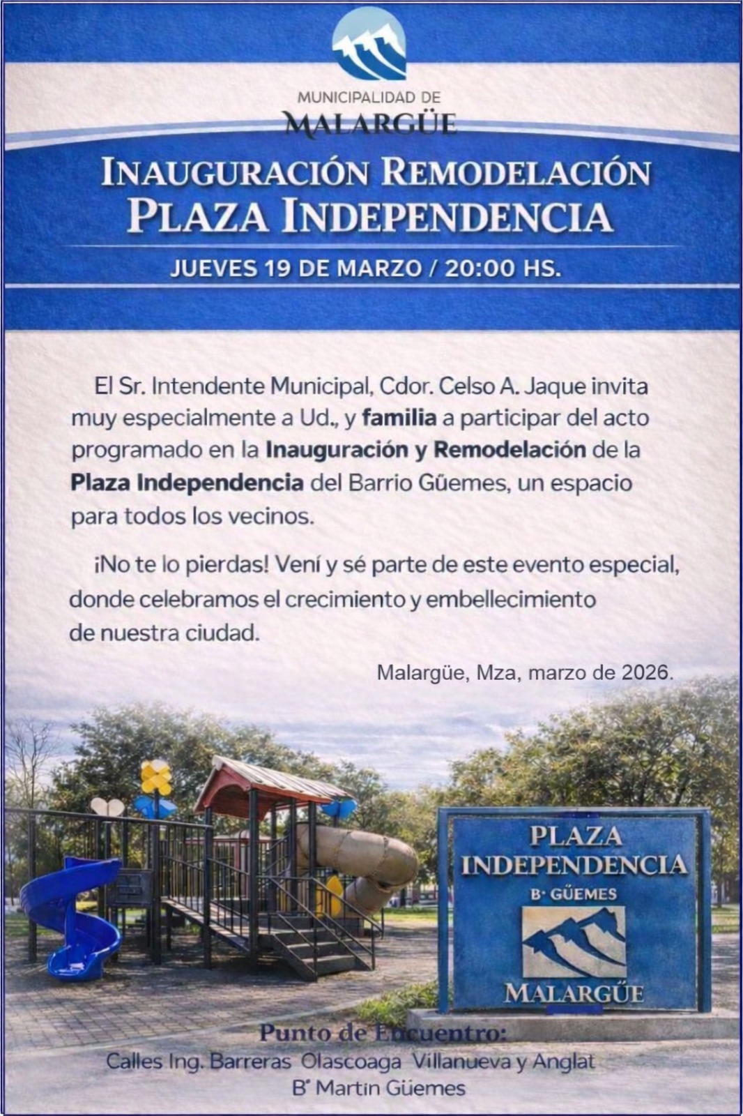 El Intendente de Malargüe, Cdor. Celso A. Jaque, invita a vecinos y familias a participar del acto de inauguración y remodelación de la Plaza Independencia del Barrio Martín Güemes, que se realizará el jueves 19 de marzo a las 20:00 horas.