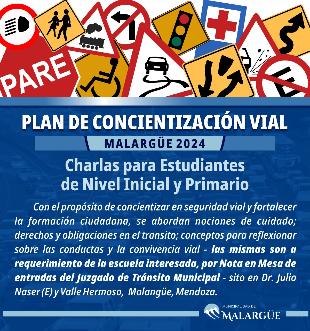 Desde el Juzgado Vial Municipal, a cargo del Dr. Juan Manuel Negro, puso en conocimiento a toda la comunidad malargüina que, de acuerdo a la problemática vial existente en todo el territorio argentino, nace el “Plan de Concientización Vial”, enmarcado con charlas para estudiantes de nivel Inicial y Primario.