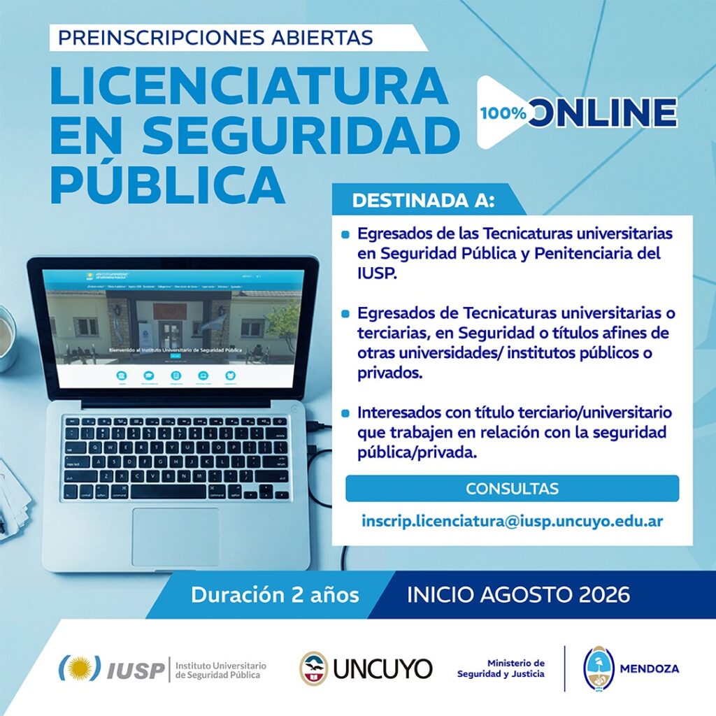 El Instituto Universitario de Seguridad Pública (IUSP) abrió las inscripciones para la nueva Licenciatura en Seguridad Pública con modalidad 100 % a distancia, una carrera orientada a ampliar el acceso a la formación superior y fortalecer la profesionalización del sistema de seguridad en Mendoza.