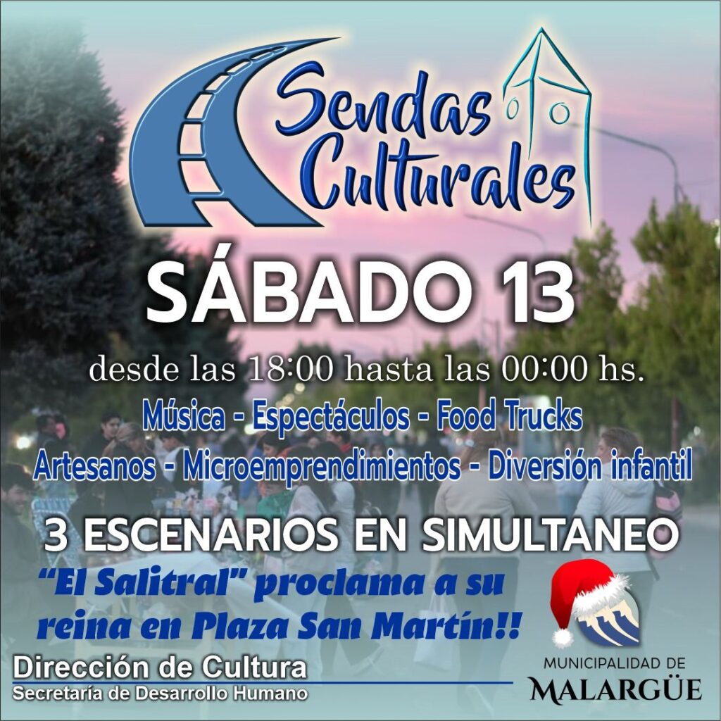 El sábado la ciudad de Malargüe vivirá una vez más las Sendas Culturales, un evento que reúne a vecinos y turistas para disfrutar de una tarde-noche llena de actividades culturales, música en vivo, gastronomía, arte y entretenimiento para toda la familia. Desde las 18:00 hasta las 00:00 horas, en plena Av. San Martin.